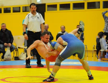 Schmerzhafte zwei Minuten verlebte Dieburgs Frank Schäffer (rot) gegen Weihers Stärksten, Marco De-Micco (blau), ehe er ausgepunktet war.